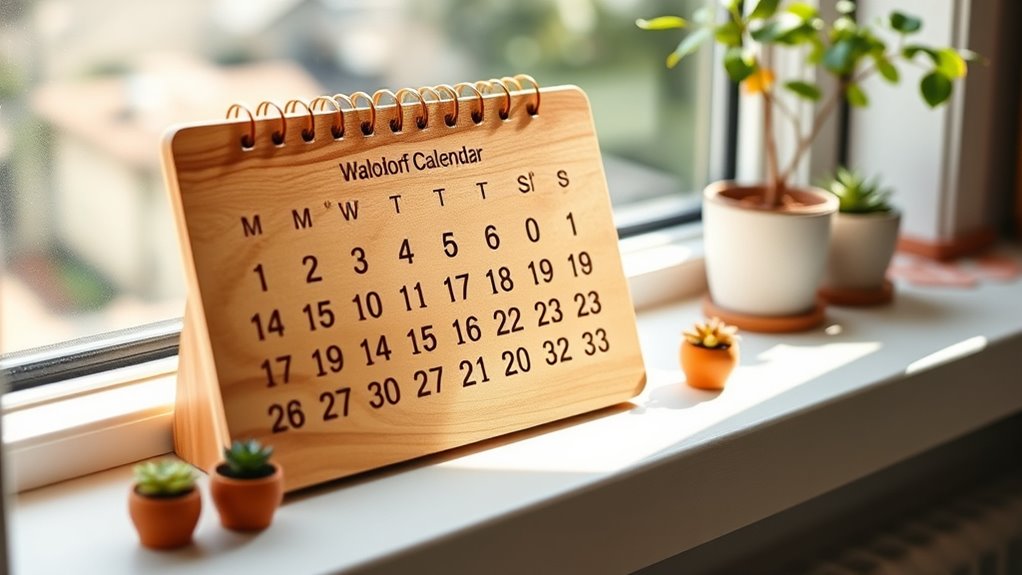A well-designed wooden Waldorf calendar combines simplicity, natural materials, and a minimalist aesthetic to create a calming presence in any space. I look for smooth finishes, rounded edges, and subtle colors that blend seamlessly with various interior styles, enhancing its visual appeal. The layout should be uncluttered, with gentle, organic shapes that support mindfulness and focus. The choice of wood type and craftsmanship details, like fine carving or gentle curves, add warmth and beauty, making the calendar a pleasing decorative piece. An appealing design encourages regular engagement, helping both children and adults connect with natural cycles and seasonal changes. Ultimately, a thoughtfully crafted aesthetic elevates the calendar from a practical tool to a harmonious part of your home’s decor.