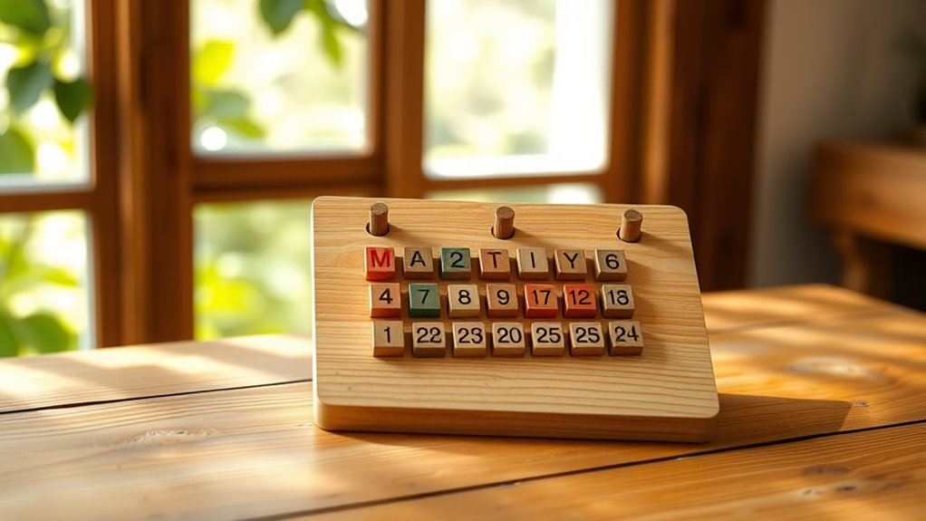 Wooden Waldorf calendars are surprisingly durable with regular use. I’ve found that high-quality wood and smooth finishes help them withstand daily handling without chipping or warping. As long as I keep them away from excessive moisture and handle them gently, they last for years, maintaining their beauty and functionality. Plus, their timeless design means they only get better with age, becoming a cherished part of my home.